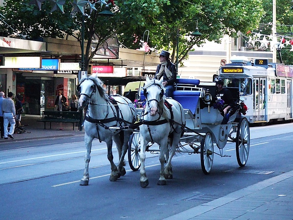 墨爾本是我在東澳旅遊以來最喜歡的一個城市,因為是先規劃後建設,所以市區街道是呈現整齊的方格狀,與雪梨迥然不同,雖然路邊偶爾還是會看到小紙屑,不過以人口這麼多的大都市來說,墨爾本算很乾淨的了,在這邊的生活真的很安逸悠閒,但又可以很豐富,難怪墨爾本會被列為全世界最適合人類居住的都市之一阿!今天是在墨爾本的最後一天,就來回顧一下到處亂走的畫面吧~市區著名的觀光馬車,白馬看起來真是太夢幻了~~如果不想坐馬車也有免費的 City Circle 35 號公車可以坐,這台車會環繞市區一圈,車上還會播放知名景點的語音介紹。